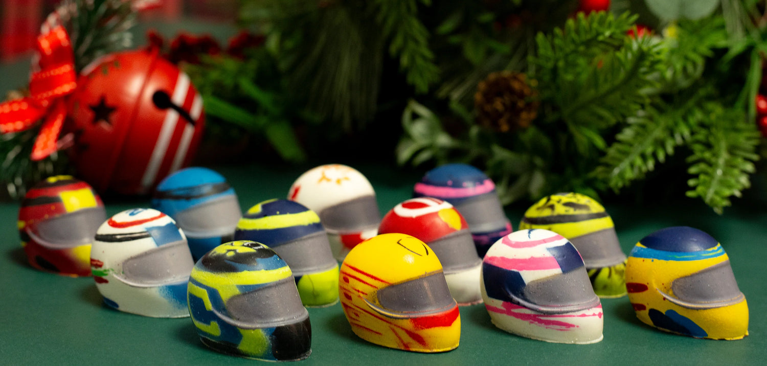 These are our filled chocolates that are shaped like racing helmets and take inspiration in their decoration from classic and contempory helmet designs from F1 and beyond.